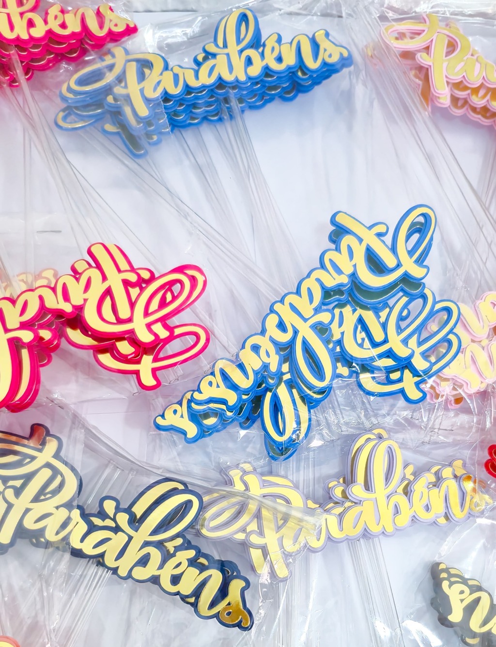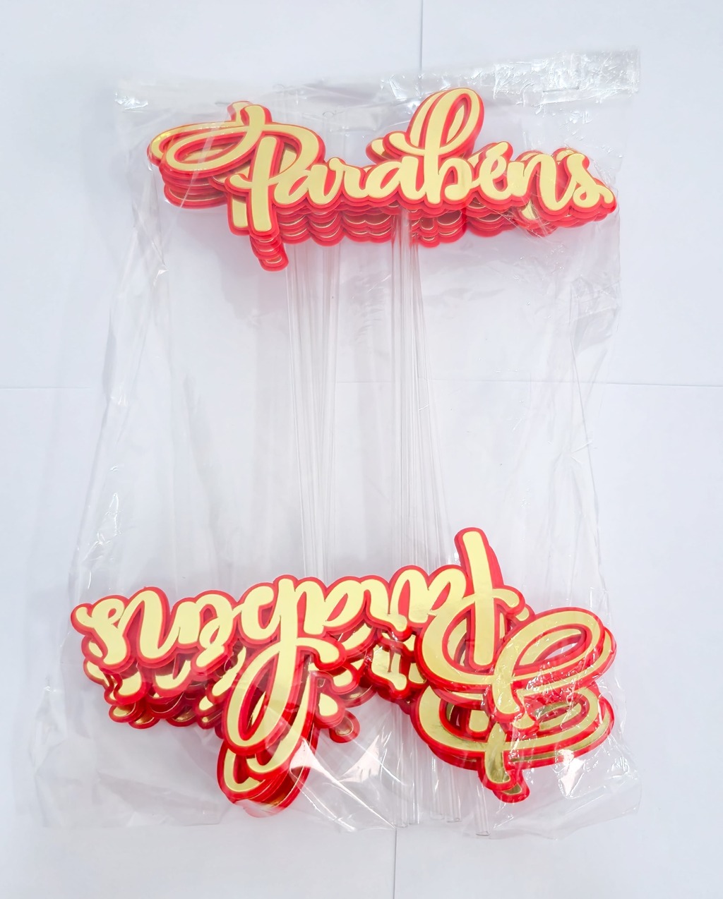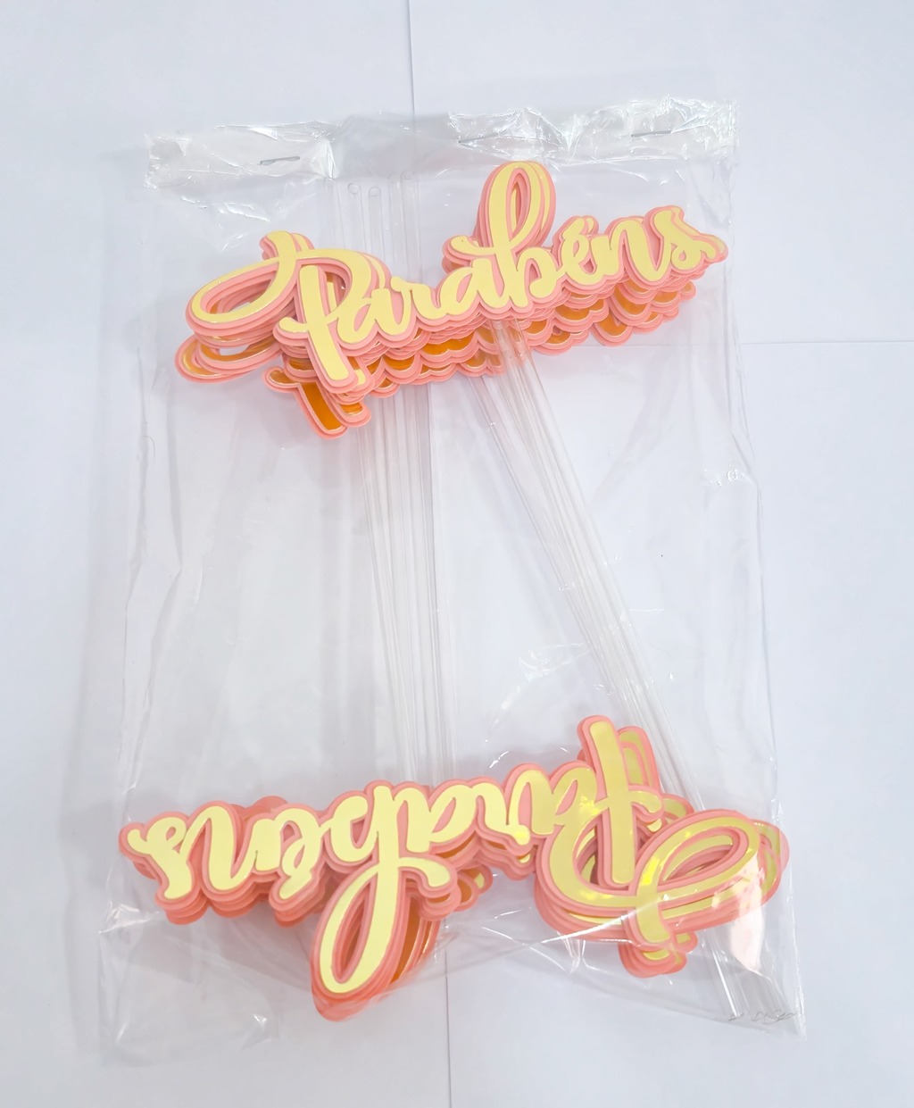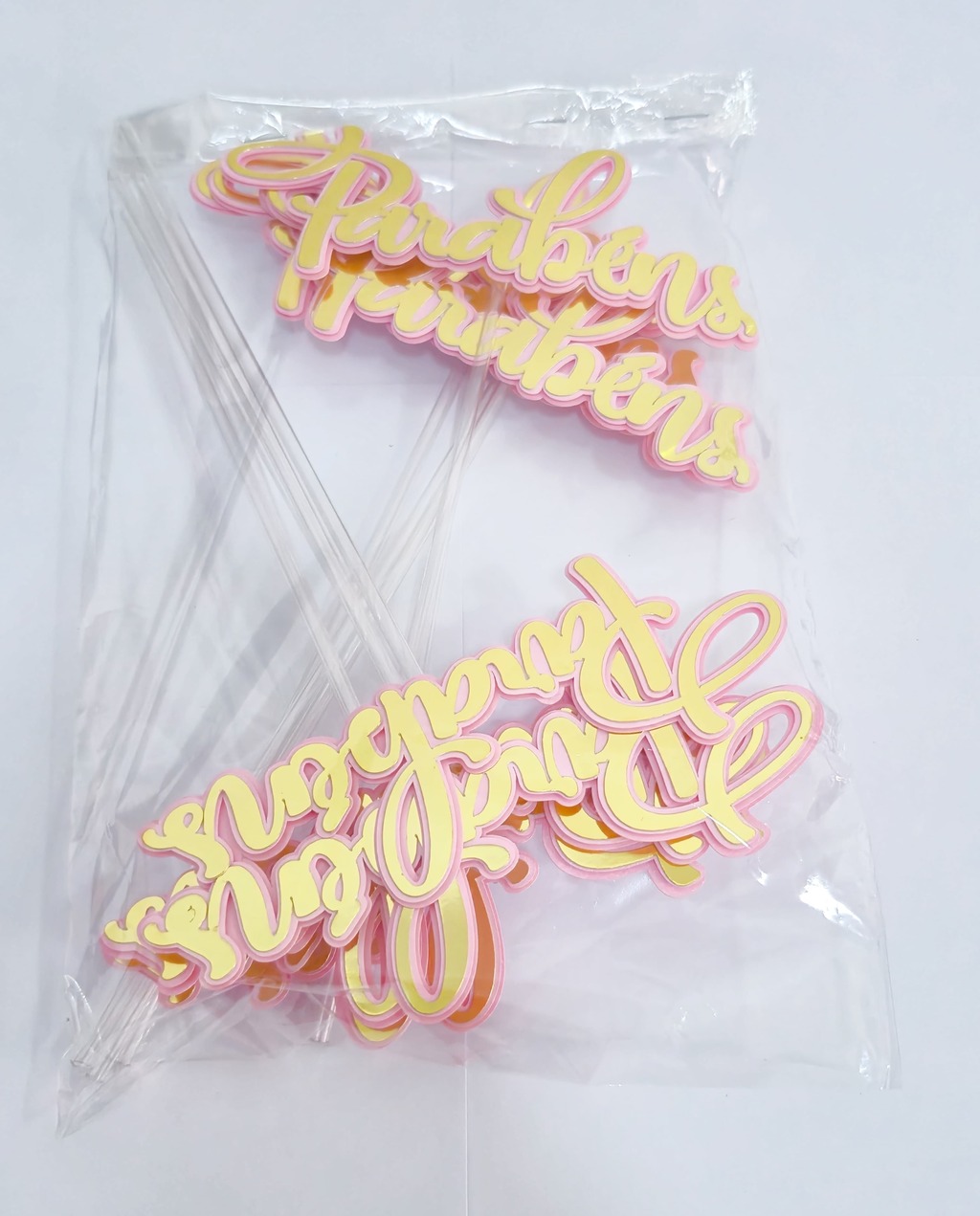Este kit contém 10 toppers de bolo com a palavra “Parabéns” em recorte especial, confeccionados em papel de alta qualidade, todos com borda 3D.
