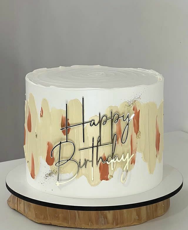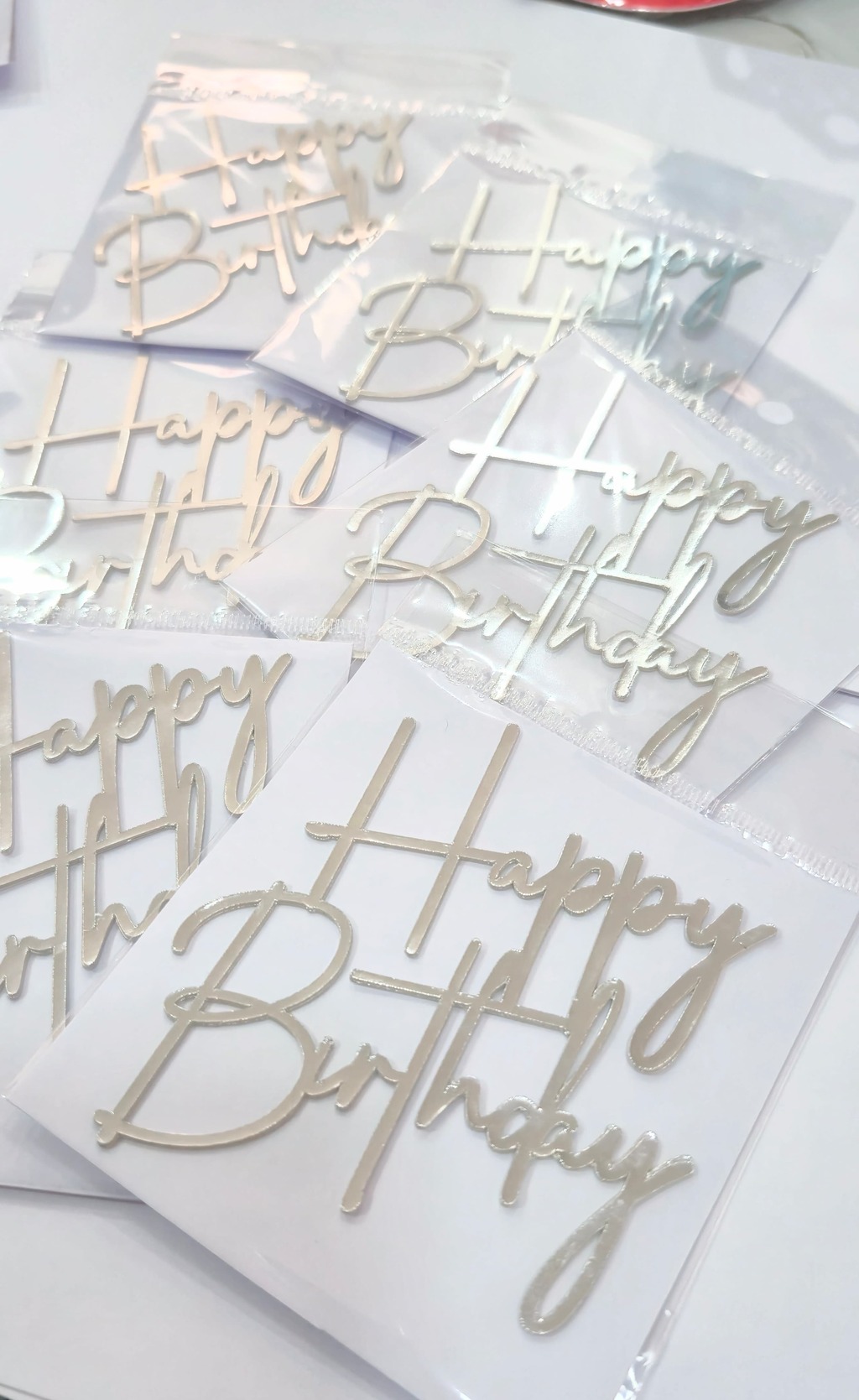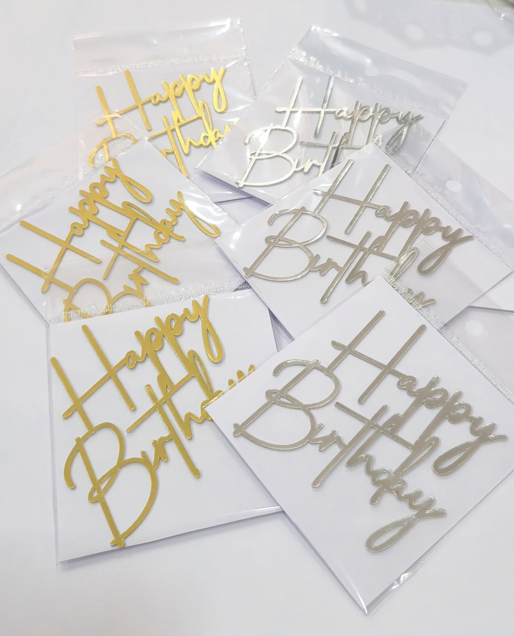 Formato: Frase “Happy Birthday” em letra cursiva estilizada;