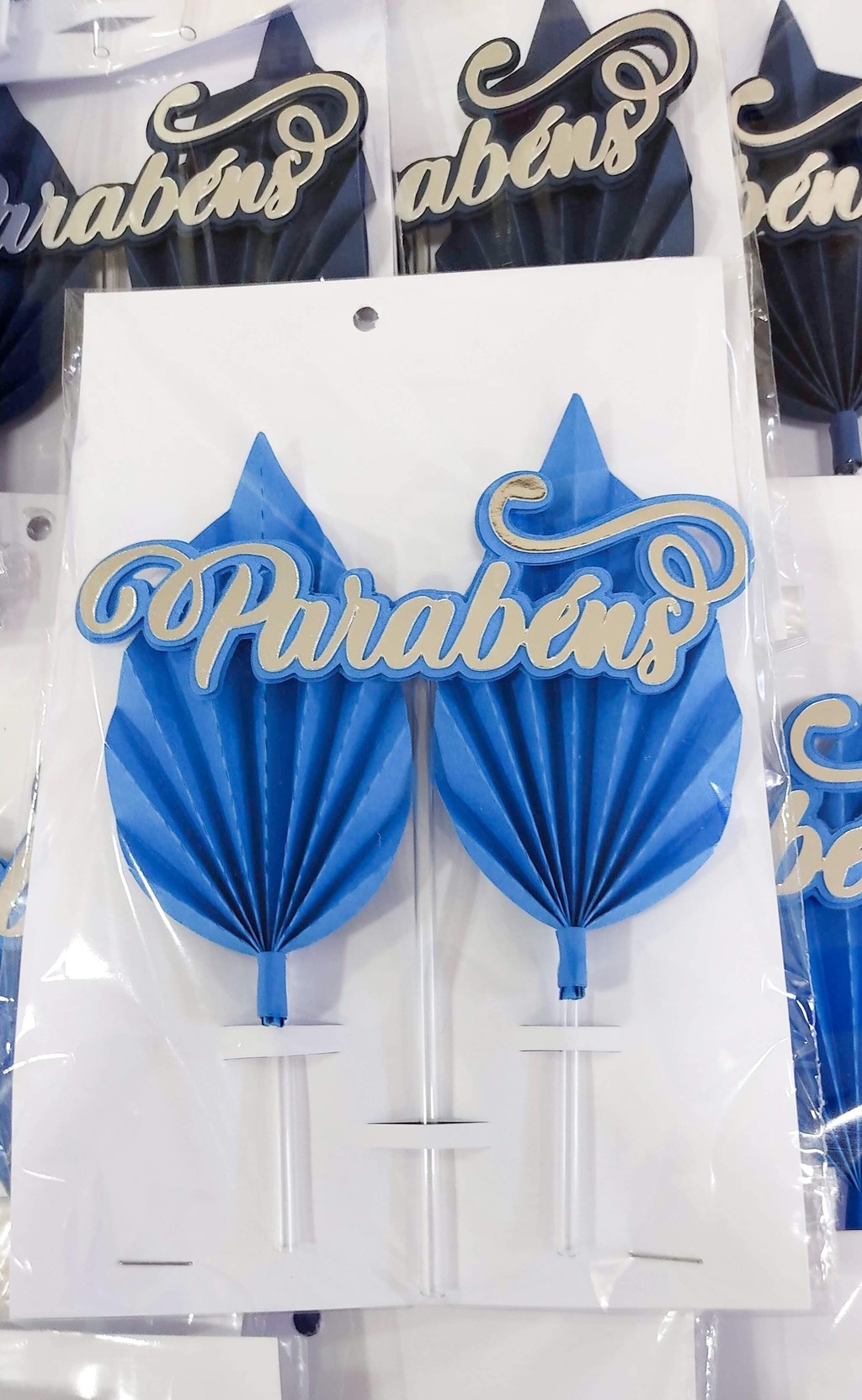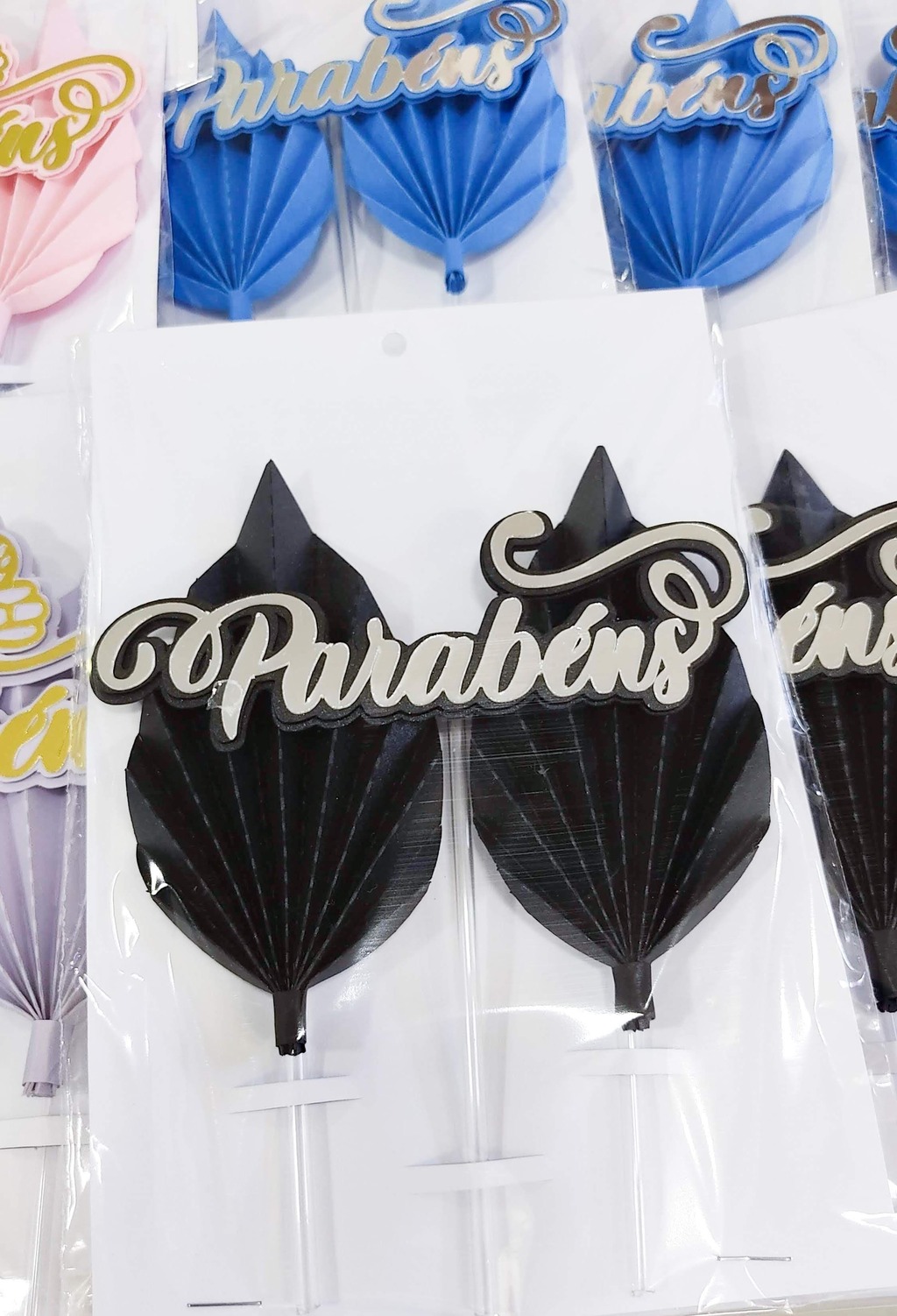 Celebre com estilo! Este topo de bolo é a escolha ideal para dar um toque sofisticado à sua decoração. Produzido em papel de alta qualidade, o conjunto traz dois ornamentos em formato de folhas com efeito sanfonado 3D, unidos por um elegante recorte escrito “Parabéns” em letra cursiva dourada e sobreposta com acabamento detalhado.
